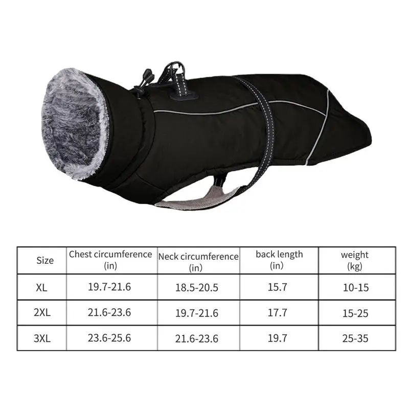 Keep your ry friend warm this winter with our Dog Winter Coat. With an upgraded collar and durable insulation, your dog will stay cozy, while fearless of splashing water due to our water-resistant design. Even in the dark, you can accurately locate your dog’s position thanks to the reflective strips. Added internal collar and lockdown ensures a snug fit. Recommended for your ry friend’s protection and comfort.