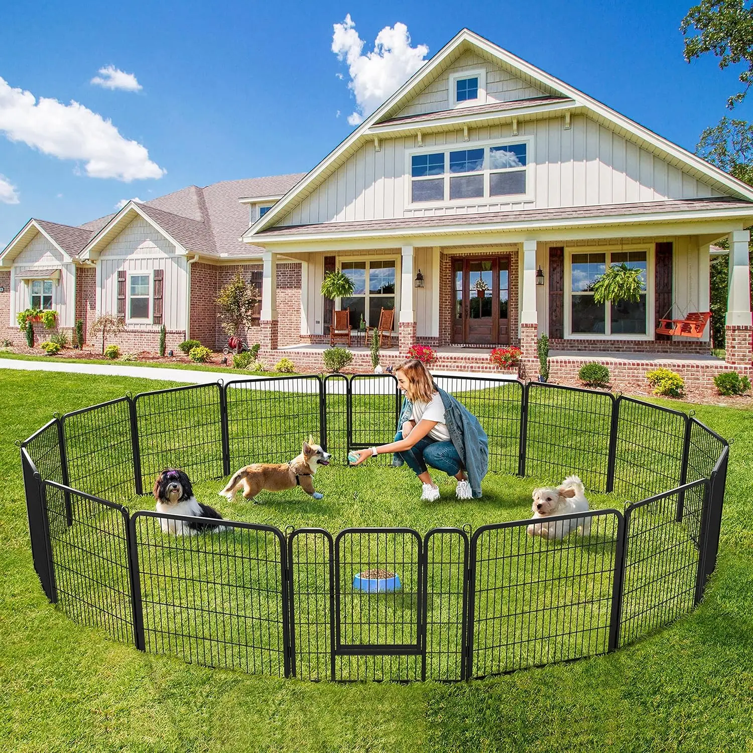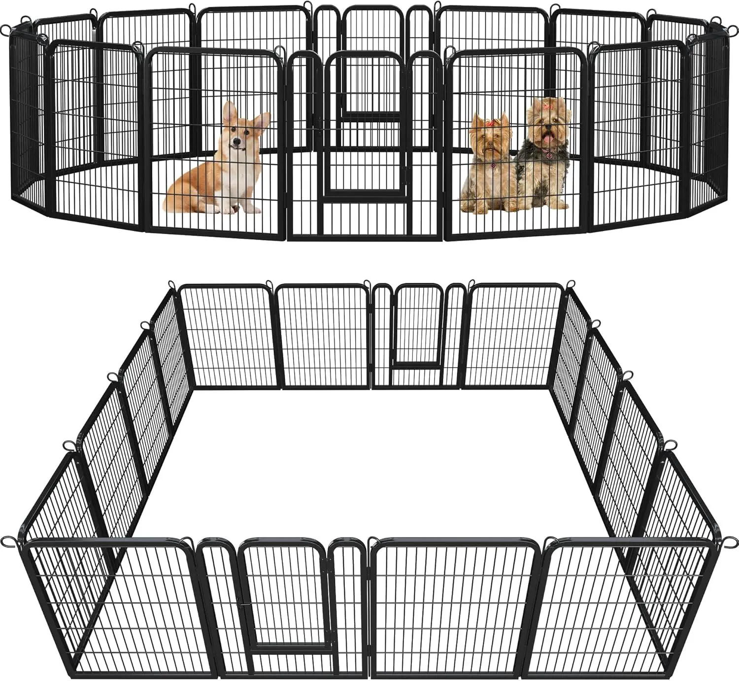 Specifications: Color: Black; Material: Metal; Quantity: 1 Set (14 x Panels; 2 x Panel with Door; 16 x Anchor Stake); Dimension for Each Panel: 26″ W × 31.5″ H × 0.6″ Thickness; Door: 24″ H × 14.4″ W; Anchor Stake: 32″ L × 0.2″ Dia. Ample Space for Play: Our interactive and extendable pet playpen provides an enclosed space with plenty of room for play and exercise, ideal for small pets No Tools Required: Simply unfold, shape, and connect the dog playpen together, exercise pen can be set up in seconds and folds flat for easy storage or travel Tips: As a precaution to ensure the safety of your furry friends, kindly remove their collars before utilizing the enclosure to prevent any untoward incidents Practical Pet Playpen: it suitable for indoor and outdoor activities, including RV camping, traveling, and yard endeavors. Additionally, it can be utilized to restrict your pets’ exercise area or as a way to separate multiple pets