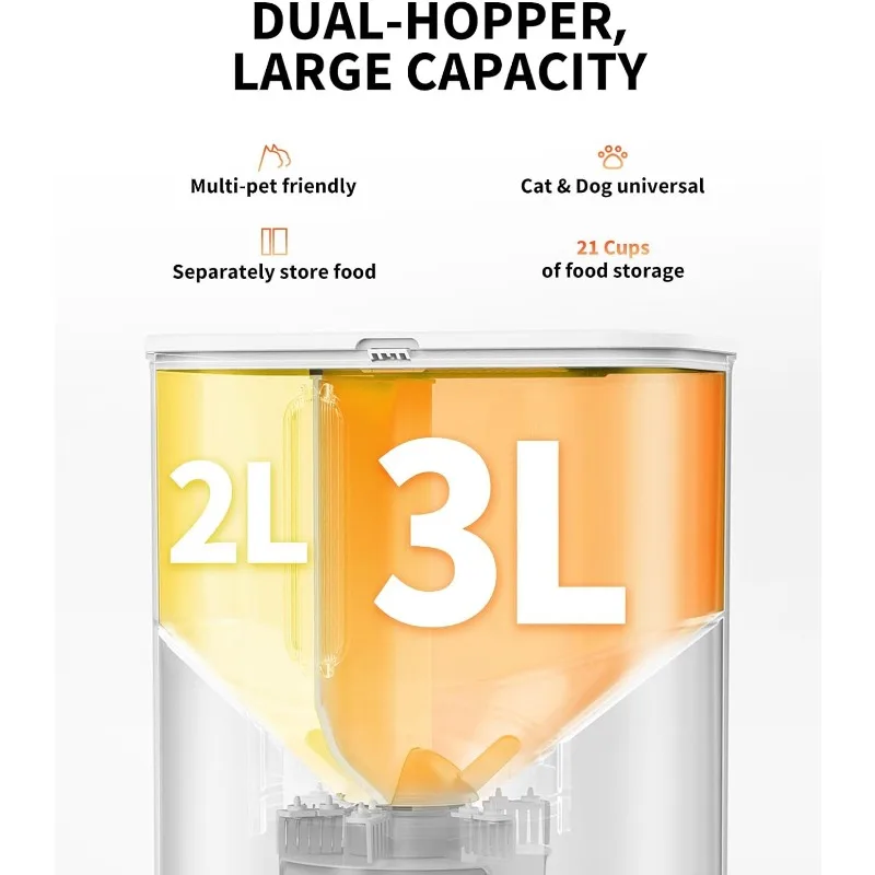 [ Innovated Double Hoppers for Various Diets ] This is the first automatic dog cat feeder with two hoppers. It can store and dispense different types of pet food separately, for example you can combine dry food with freeze dried food or air dried food to provide your fur child with a nutritious mix of every meal. This feeder is especially suitable for picky eaters/changed feeding recipes/pregnant or post-surgery pets.